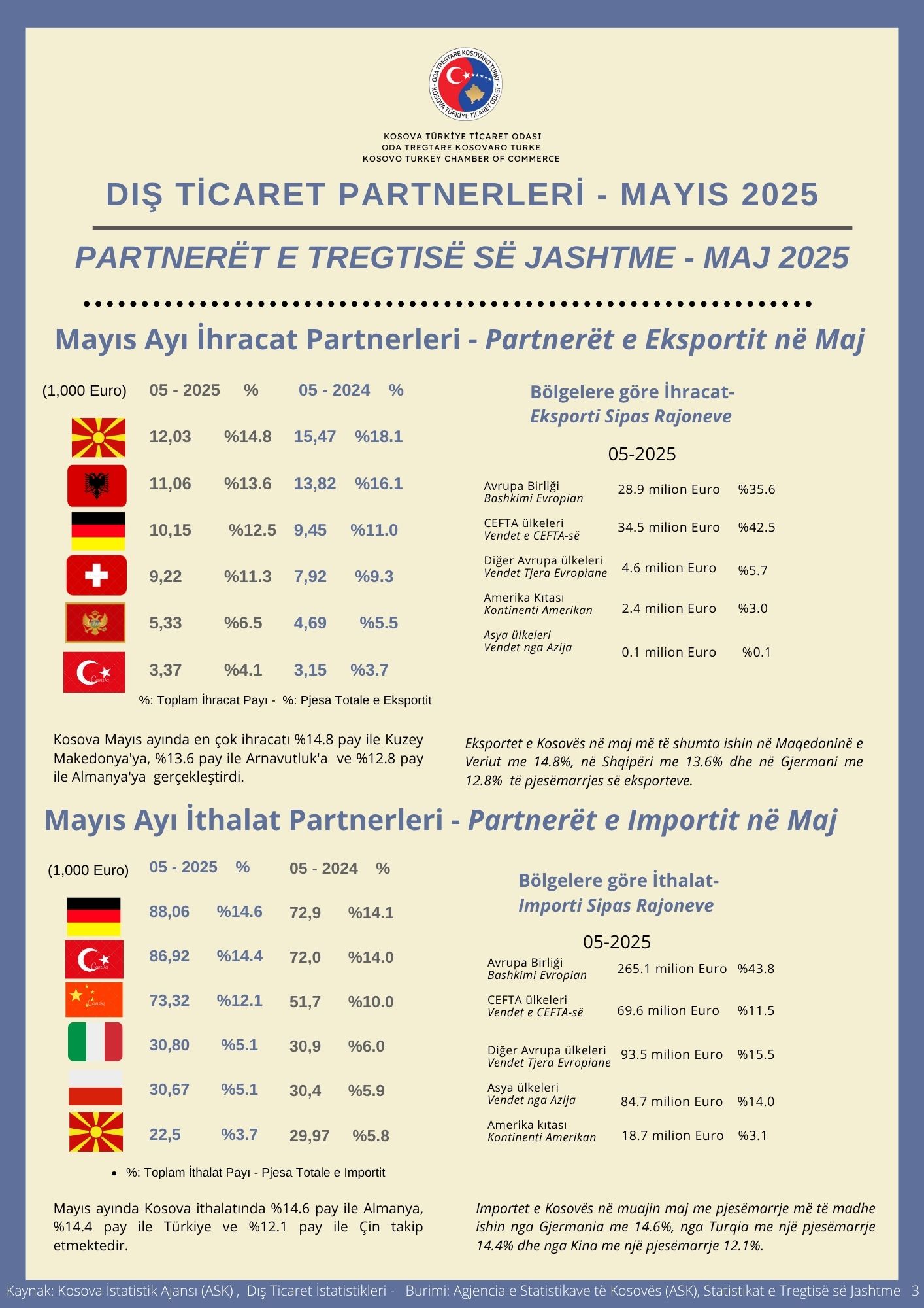 Odamızın,"Dış Ticaret İstatistikleri (Mayıs 2025)" adlı yeni çalışmamızda, Kosova Cumhuriyeti'nin Mayıs ayına ilişkin ticaret verilerini yıllara, başlıca ürün gruplarına ve ticaret partnerlerine göre değerlendirdik.