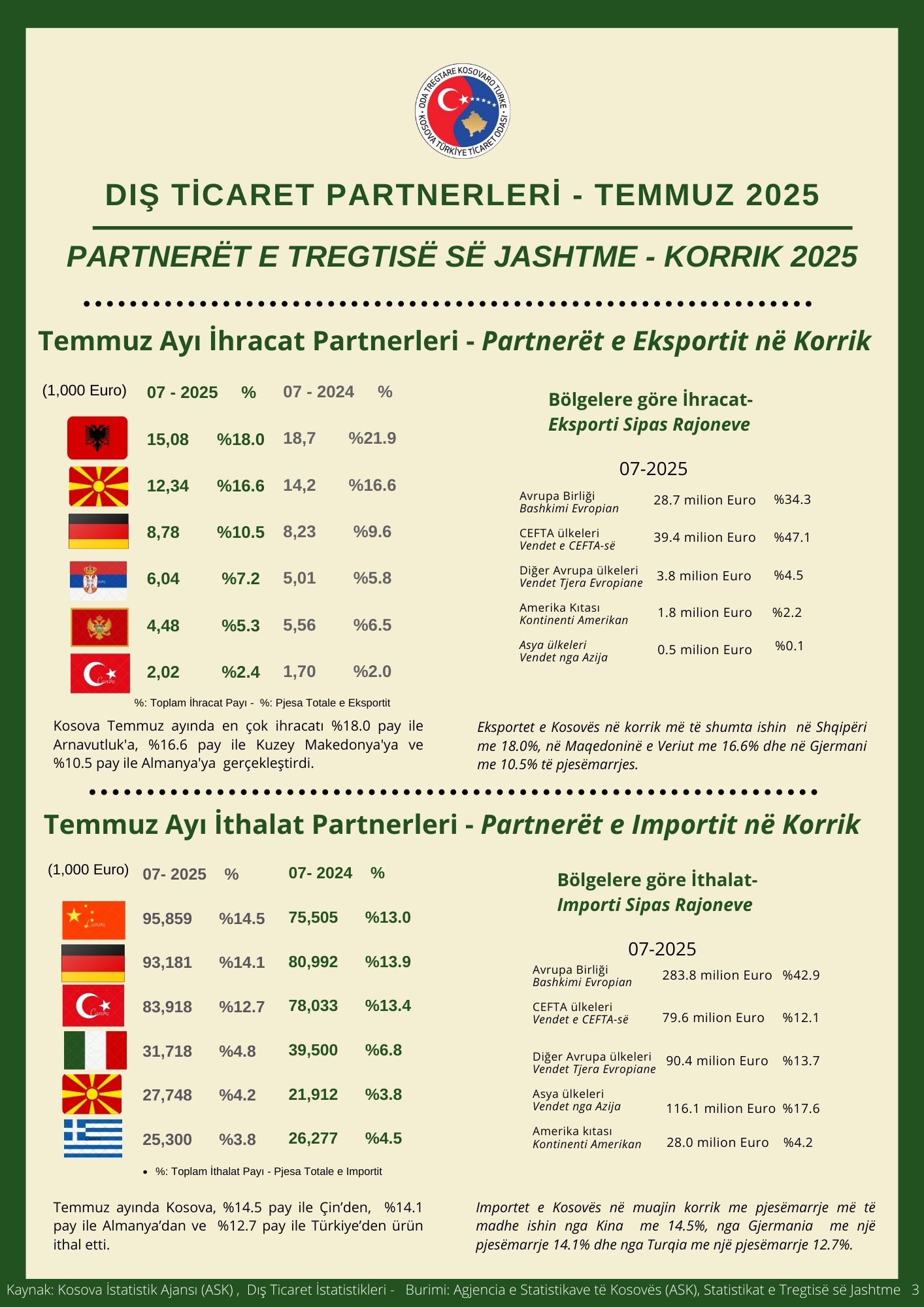 Odamızın,"Dış Ticaret İstatistikleri (Temmuz 2025)" adlı yeni çalışmamızda, Kosova Cumhuriyeti'nin Temmuz ayına ilişkin ticaret verilerini yıllara, başlıca ürün gruplarına ve ticaret partnerlerine göre değerlendirdik.