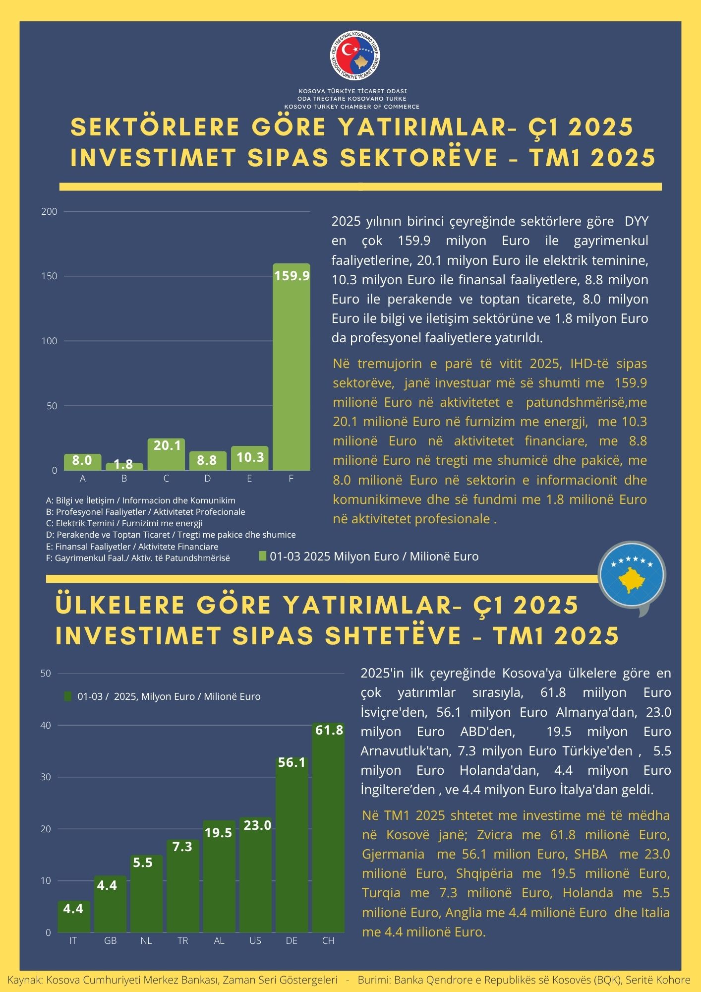Odamızın, "DOĞRUDAN YABANCI YATIRIMLAR (Ç1 2025)" adındaki yeni çalışmamızda, Kosova'ya 2025'in ilk üç ayında gelen doğrudan yabancı yatırımları yapısına, sektörlerine ve ülkelerine göre değerlendirdik.