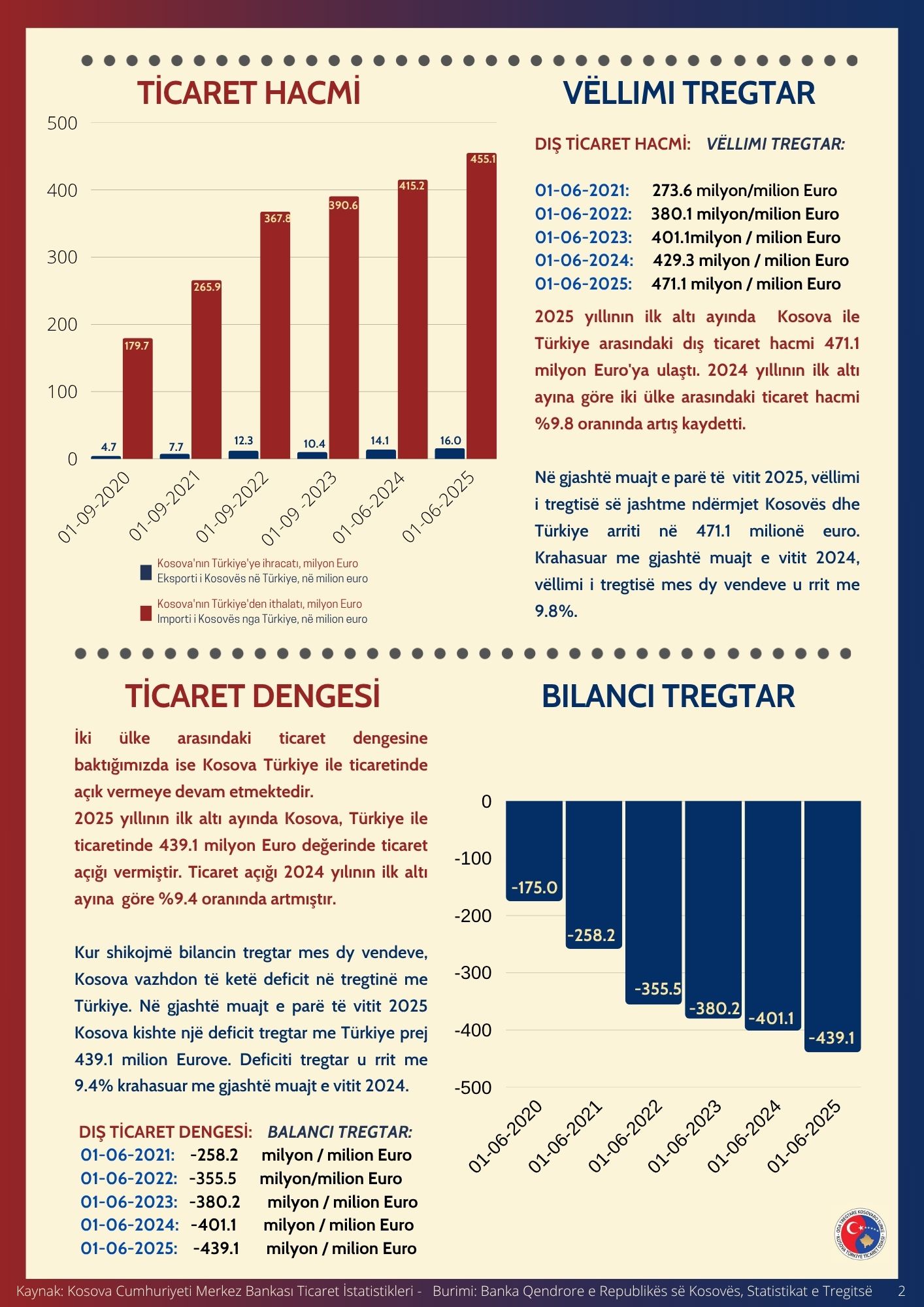 Odamızın, "Kosova ile Türkiye Arasındaki Ticaret (01-06 2025)" adlı yeni çalışmamızda, Kosova'nın Türkiye ile 2025 yılının ilk altı ayında gerçekleşen ticaretini derledik.