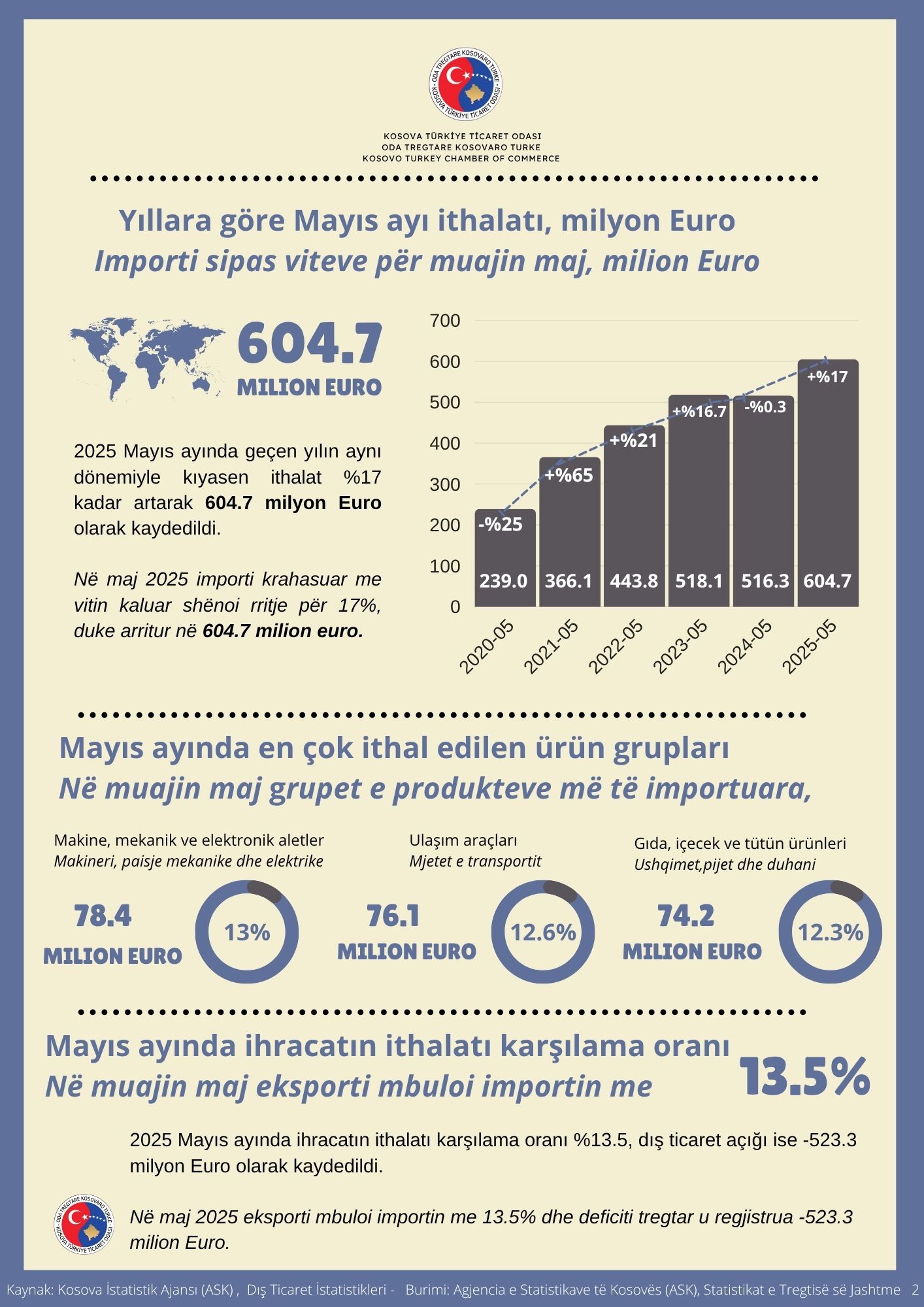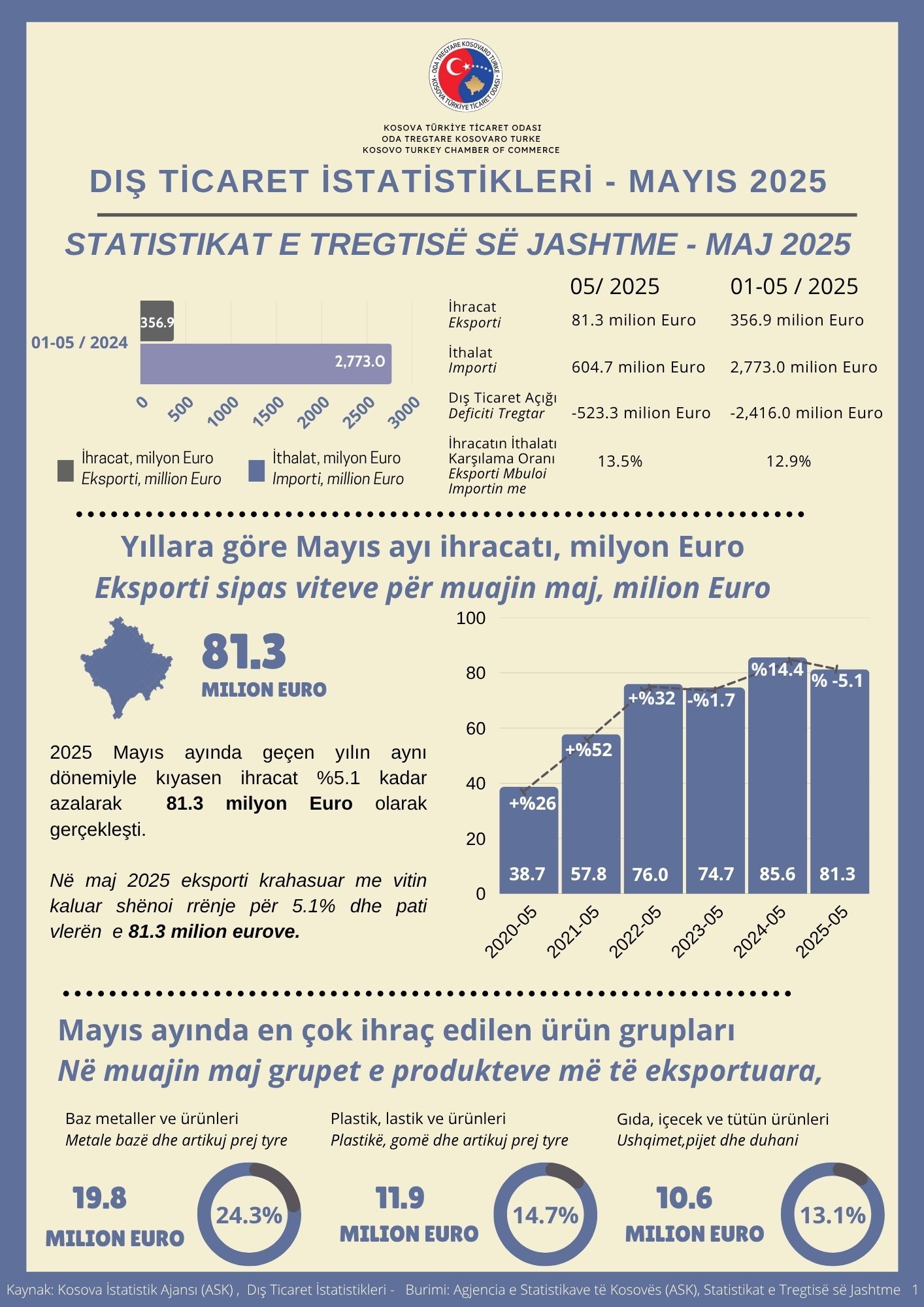 Odamızın,"Dış Ticaret İstatistikleri (Mayıs 2025)" adlı yeni çalışmamızda, Kosova Cumhuriyeti'nin Mayıs ayına ilişkin ticaret verilerini yıllara, başlıca ürün gruplarına ve ticaret partnerlerine göre değerlendirdik.