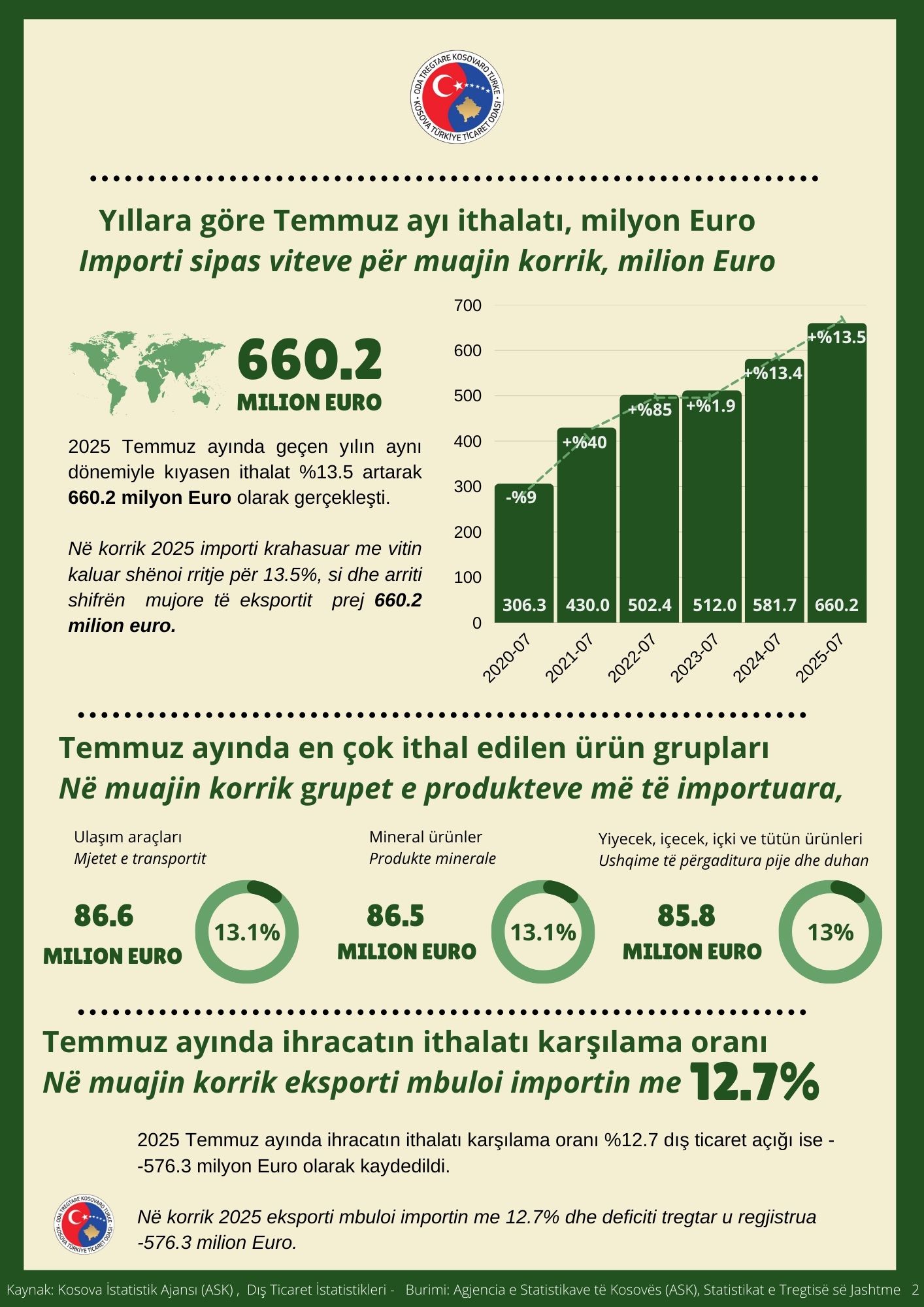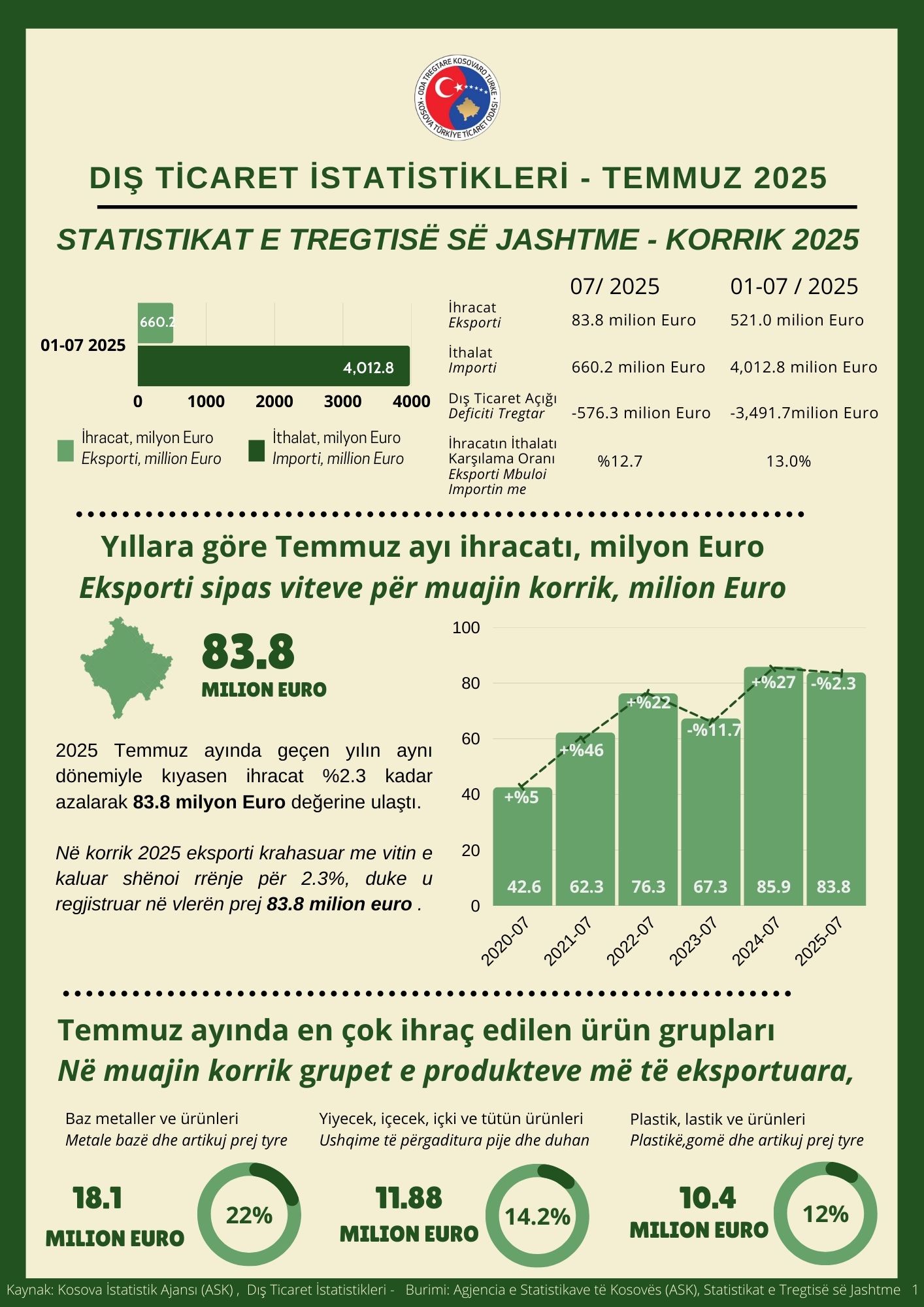 Odamızın,"Dış Ticaret İstatistikleri (Temmuz 2025)" adlı yeni çalışmamızda, Kosova Cumhuriyeti'nin Temmuz ayına ilişkin ticaret verilerini yıllara, başlıca ürün gruplarına ve ticaret partnerlerine göre değerlendirdik.