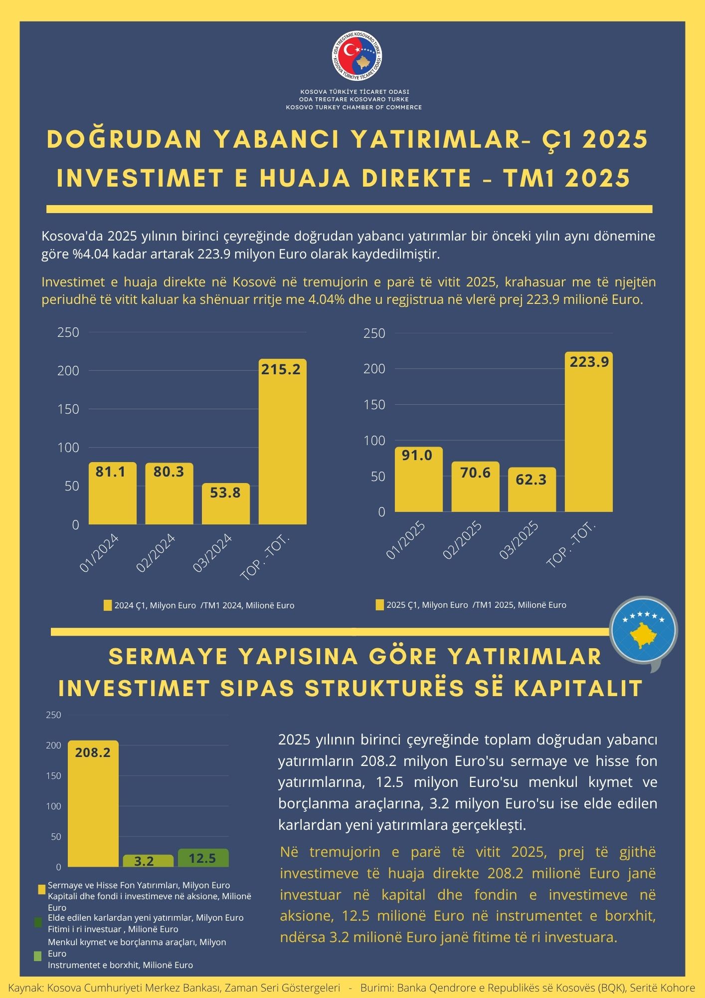 Odamızın, "DOĞRUDAN YABANCI YATIRIMLAR (Ç1 2025)" adındaki yeni çalışmamızda, Kosova'ya 2025'in ilk üç ayında gelen doğrudan yabancı yatırımları yapısına, sektörlerine ve ülkelerine göre değerlendirdik.