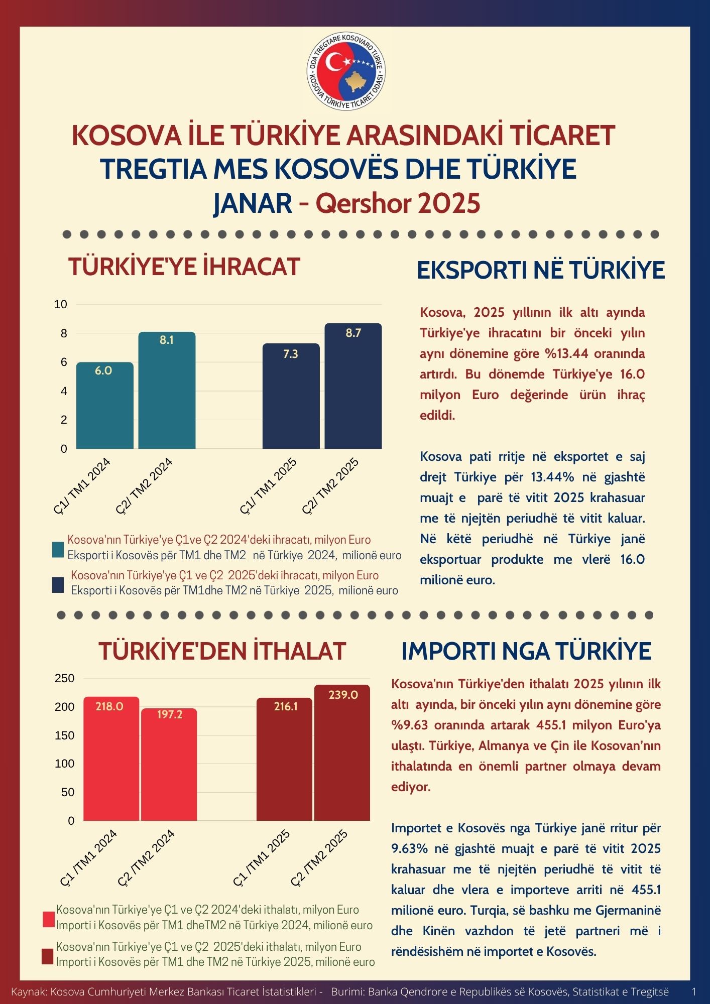 Odamızın, "Kosova ile Türkiye Arasındaki Ticaret (01-06 2025)" adlı yeni çalışmamızda, Kosova'nın Türkiye ile 2025 yılının ilk altı ayında gerçekleşen ticaretini derledik.
