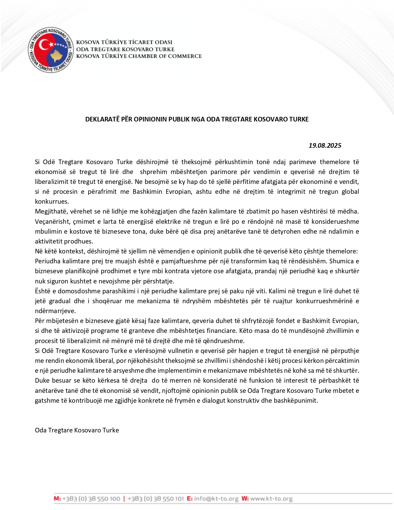 19.08.2025 - Kosova Türkiye Ticaret Odası olarak, serbest piyasa ekonomisinin temel ilkelerine bağlılığımızı ve enerji piyasasının serbestleştirilmesi yönündeki hükümet kararını prensipte desteklediğimizi belirtmek isteriz. Bunun hem Avrupa Birliği ile uyum süreci hem de küresel rekabetçi piyasaya entegre olma bakımından uzun vadede ekonomiye katkı sağlayacağına inanıyoruz.